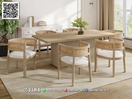 Perpaduan antara meja kayu solid dan kursi rotan anyaman alami menciptakan harmoni yang menenangkan. Tekstur rotan memberikan sentuhan artistik sekaligus memperkuat nuansa tropis yang santai. Finishing natural pada permukaan meja menghadirkan tampilan bersih dan menonjolkan keindahan serat kayu yang autentik. Set ini juga dilengkapi kursi dengan dudukan empuk, menjadikannya nyaman digunakan dalam waktu lama.