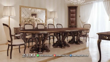 Meja makan mewah jepara jati berkualitas tinggi dengan desain klasik elegan, dibuat dari kayu jati pilihan, kokoh, rapi, dan nyaman.