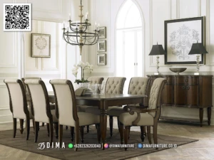 Permukaan meja yang lebar memberikan ruang yang cukup untuk kebutuhan makan sehari-hari, sekaligus tetap nyaman digunakan saat menjamu tamu. Detail pada kaki meja serta ukiran halus menghadirkan nuansa klasik tanpa terasa berlebihan. Kursinya didesain dengan sandaran empuk dan bentuk ergonomis, sehingga tetap nyaman dipakai meski dalam waktu lama. Kombinasi warna jati tua dan kain lembut membantu menciptakan suasana ruang makan yang hangat, rapi, dan lebih classy.
