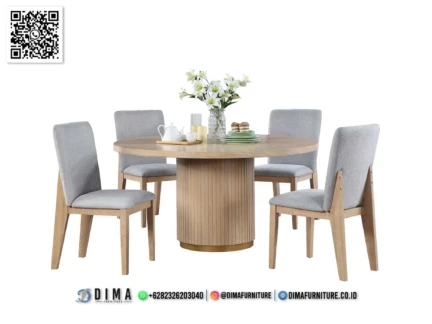 Meja makan minimalis jepara calestine menawarkan tampilan yang simpel, hangat, dan mudah menyatu dengan berbagai gaya interior rumah. Mengusung konsep minimalis modern, meja makan ini melihatkan kesan rapi dan elegan tanpa perlu banyak detail. Warna kayu yang lembut serta bentuk meja bundar membuat suasana makan terasa lebih nyaman dan akrab.