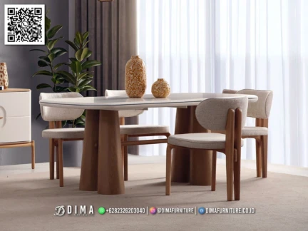 Model meja makan ini cocok digunakan di rumah modern, apartemen, maupun ruang makan bergaya minimalis natural.