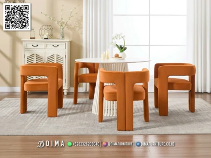 Kursi luxeora hadir dengan warna caramel orange yang hangat dan lembut di mata. Kain pelapis beludru lembut (velvet) memberikan tampilan mewah tanpa terasa berlebihan. Bentuk sandaran yang melengkung menambah kenyamanan sekaligus mempertegas karakter desain modern.