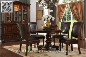 Set meja makan bundar mewah klasik bellmore dirancang untuk anda yang menghargai keindahan ukiran jepara dan kenyamanan ruang makan.