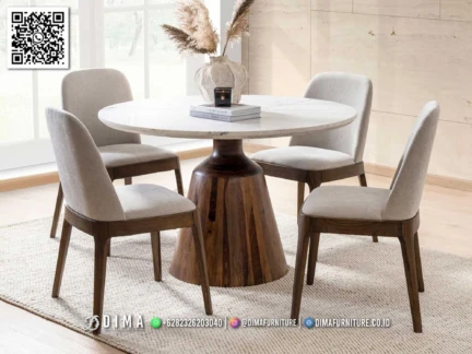 Terinspirasi dari tren interior kontemporer, meja makan ini memiliki bentuk bulat yang memberikan kesan harmonis dan ramah untuk berbagai aktivitas bersama keluarga. Permukaan meja yang halus dengan tekstur kayu alami menghadirkan nuansa hangat, sementara kursi empuk berlapis kain lembut memberikan kenyamanan saat digunakan dalam waktu lama.