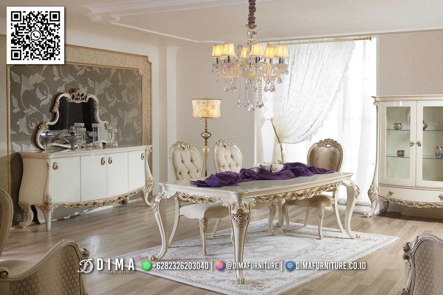 Set meja makan mewah furniture jepara ini cocok untuk kamu yang ingin menghadirkan suasana ruang makan yang rapi, hangat, dan terlihat berkelas. Desainnya mengusung gaya klasik elegan dengan sentuhan ukiran khas furniture jepara yang halus dan proporsional. Warna ivory memberi kesan bersih dan nyaman, mudah dipadukan dengan berbagai konsep interior rumah.