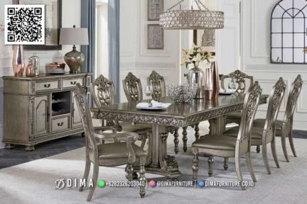 Desain meja makan klasik ini mudah dipadukan dengan berbagai konsep interior, mulai dari rumah bergaya klasik, luxury, hingga modern klasik. Ukiran halus pada bagian kaki meja dan sandaran kursi menjadi ciri khas utama, menjadikan set ini tidak hanya fungsional, tapi juga bernilai estetika tinggi.