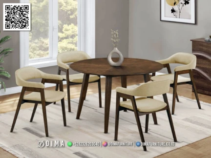 Ukuran meja yang tidak terlalu besar membuatnya pas untuk rumah minimalis atau apartemen. Bentuk bundar juga membantu menghemat ruang dan memudahkan komunikasi saat makan bersama. Set ini terdiri dari meja dan kursi dengan dudukan empuk, sehingga lebih nyaman dibanding kursi kayu biasa.