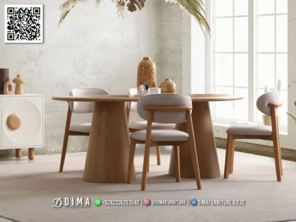 Ciri utama meja makan minimalis modern terlihat dari bentuk meja yang proporsional dan garis desain yang bersih. Model seperti ini mudah dipadukan dengan kursi kain, kursi kayu, maupun kursi modern lainnya. Warna natural kayu memberi kesan hangat dan membuat ruang makan terasa lebih hidup.